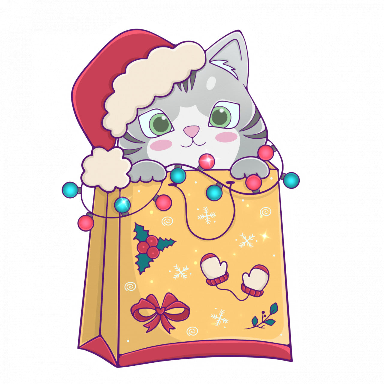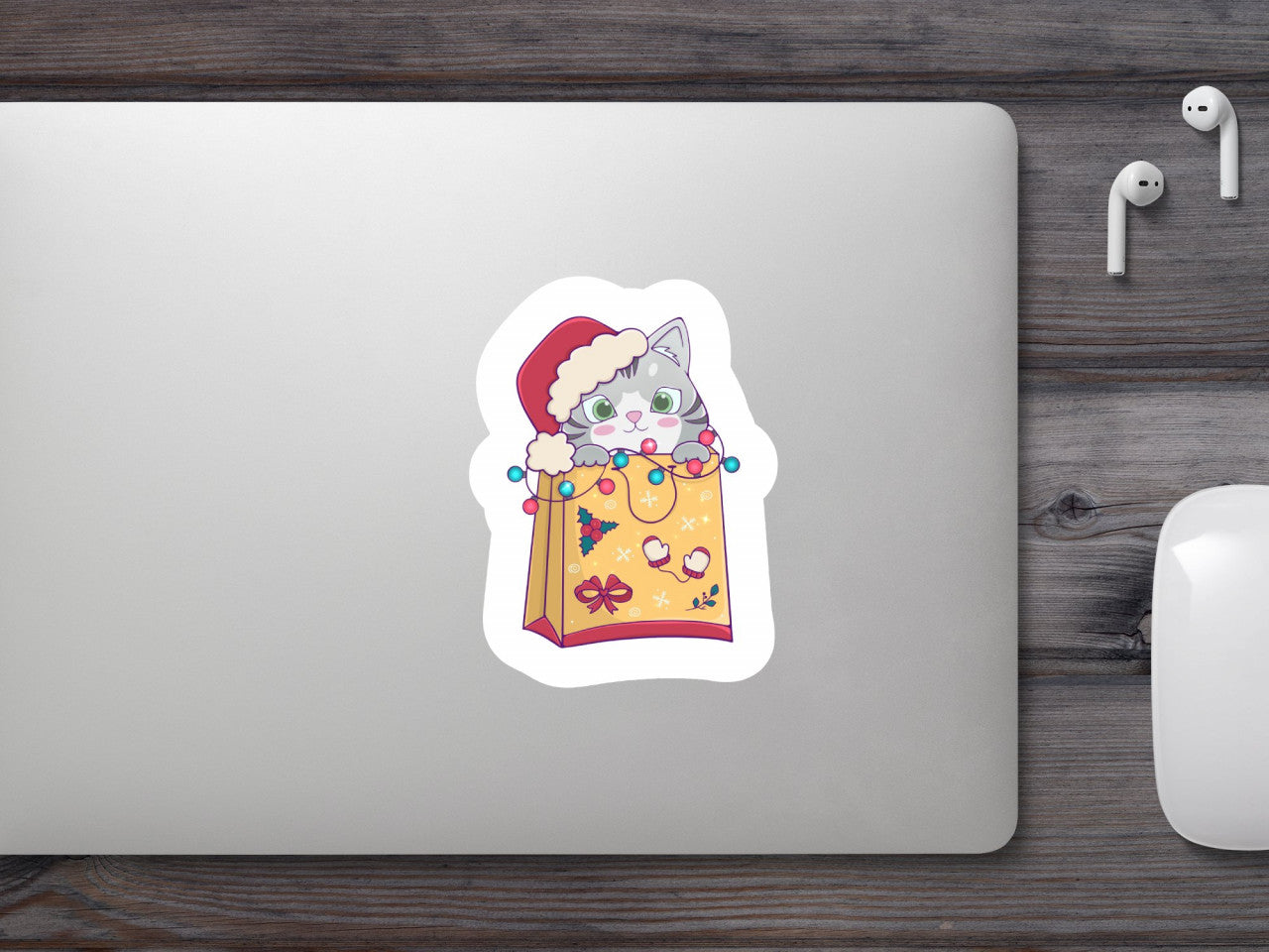 Set 5 bucati, Sticker decorativ, Pisica cadou de Craciun, Rezistent la apa, NO10179, 6 cm, Multicolor