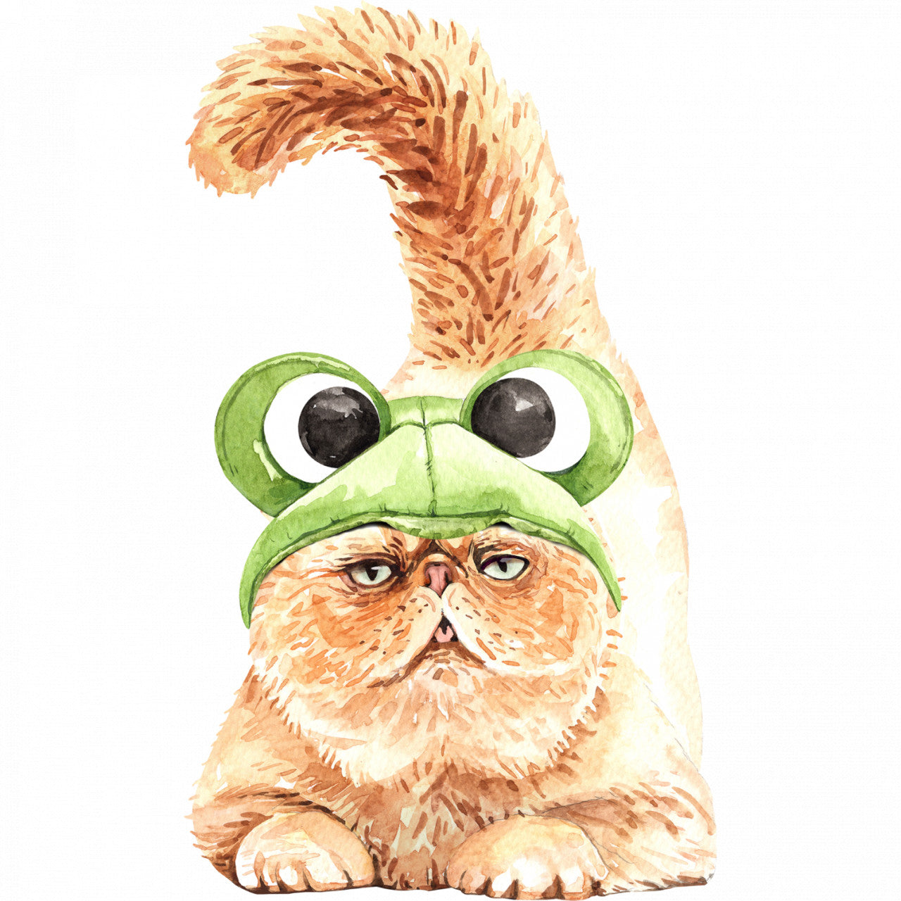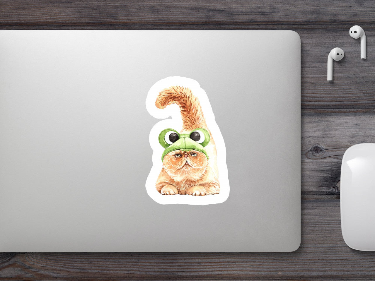 Set 5 bucati, Sticker decorativ, Pisica cu caciula broasca, Rezistent la apa, NO10188, 6 cm, Multicolor