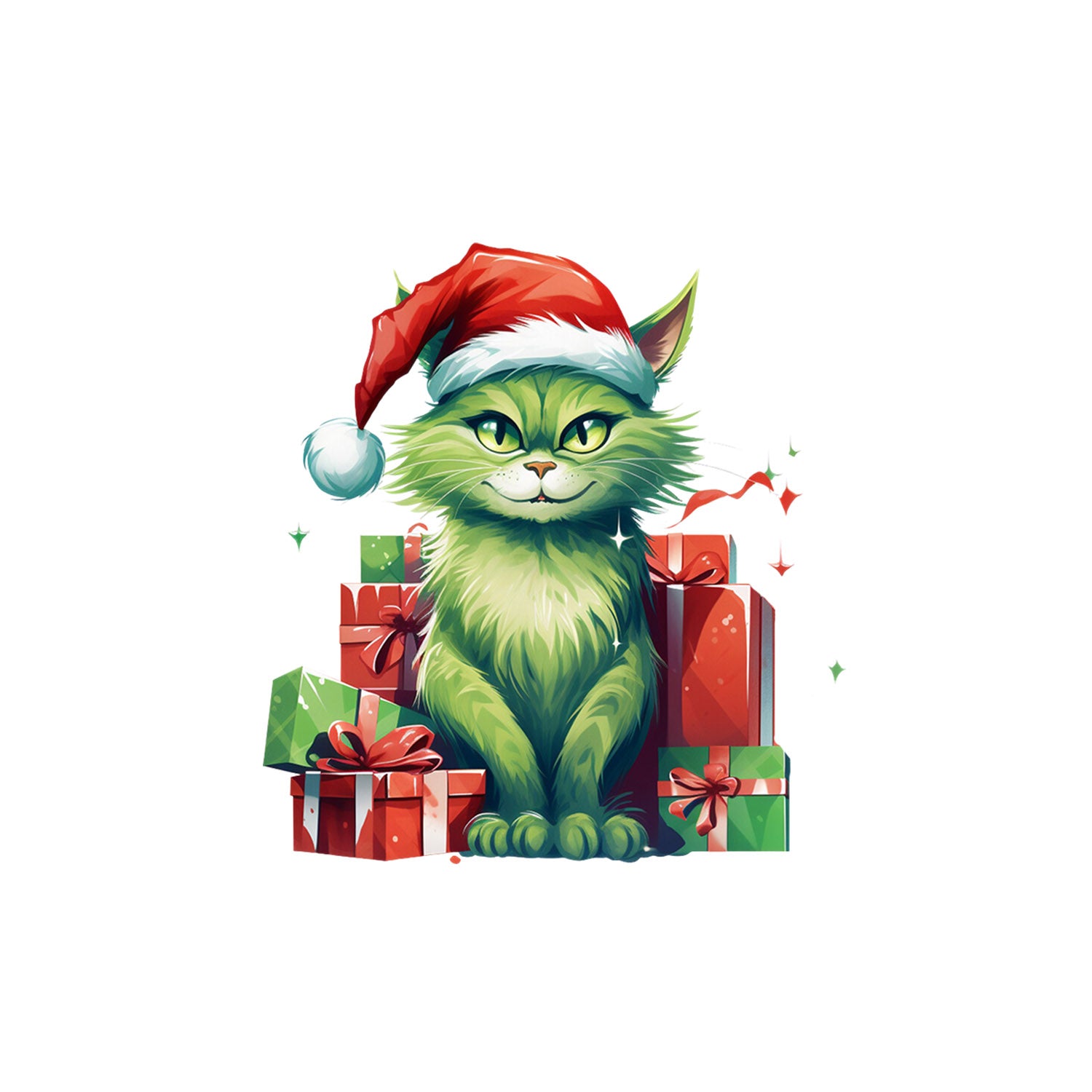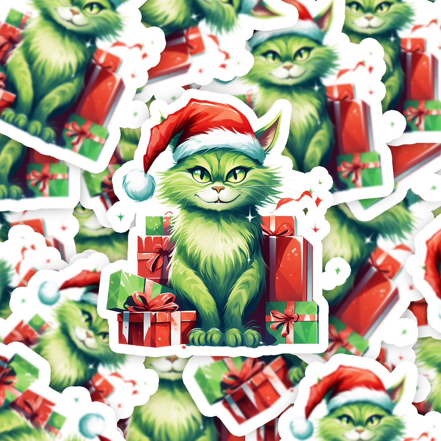 Set 5 bucati, Sticker decorativ, Pisica Grinch fericita langa cadouri, Rezistent la apa, NO16208, 6 cm, Multicolor