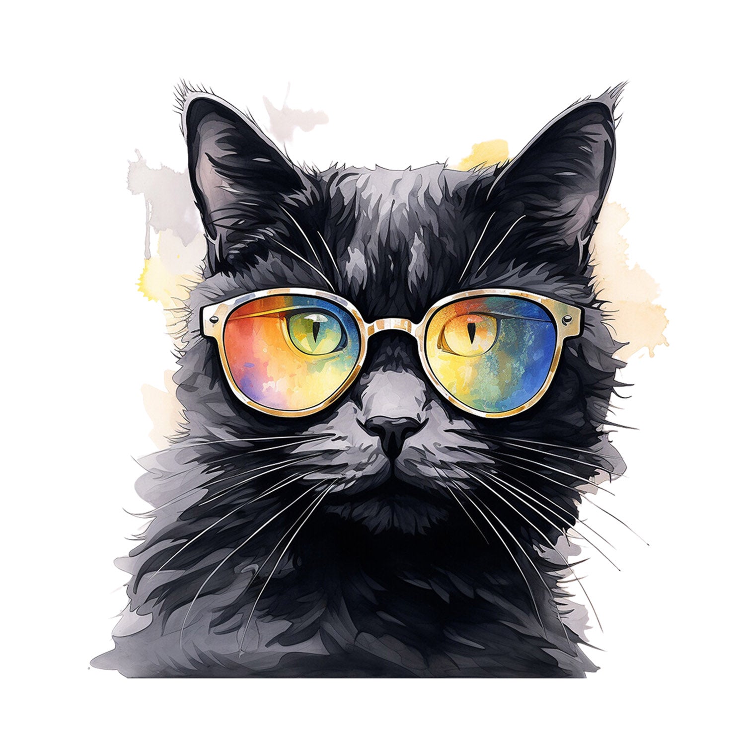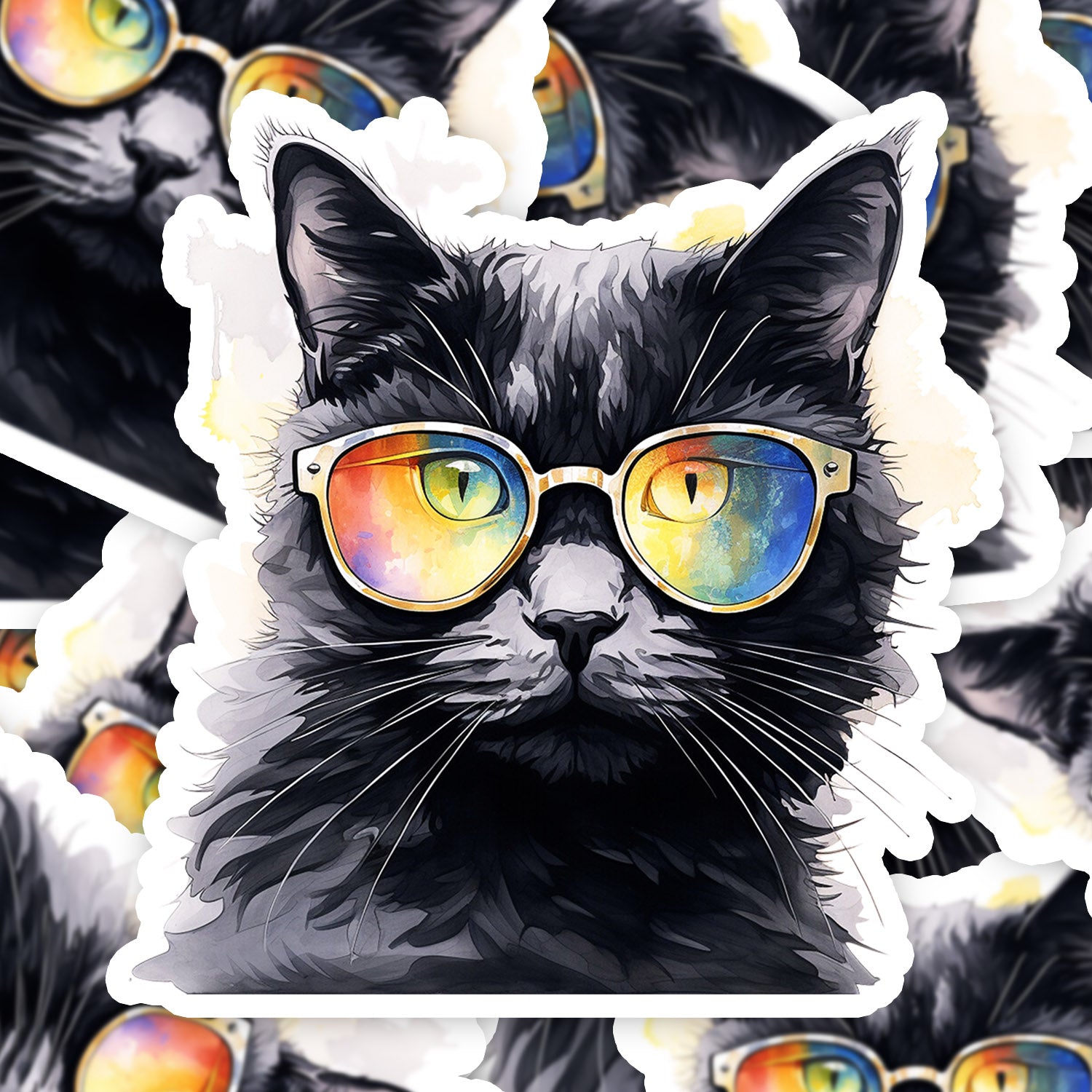 Set 5 bucati, Sticker decorativ, Pisica neagra cu ochelari, Rezistent la apa, NO10628, 6 cm, Multicolor