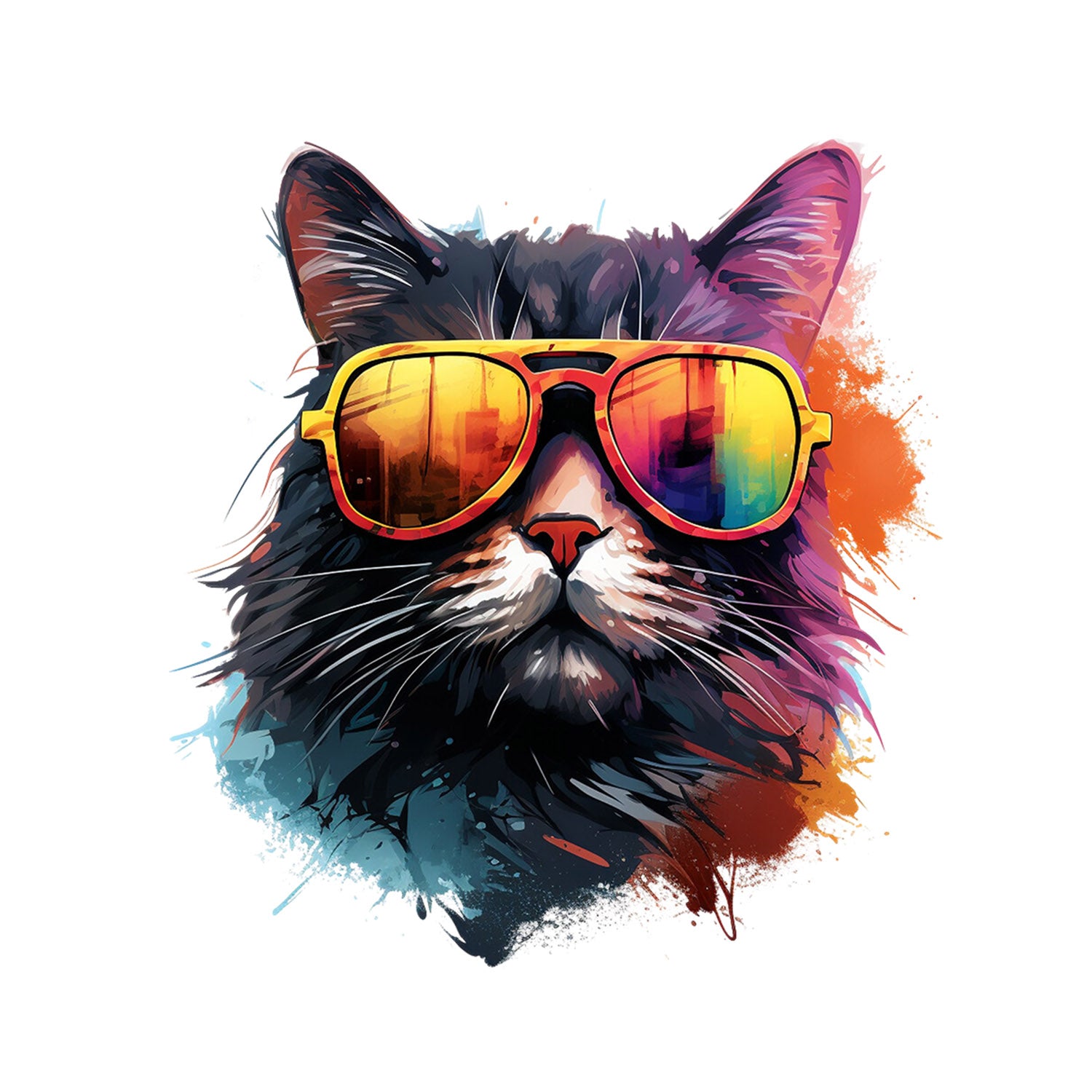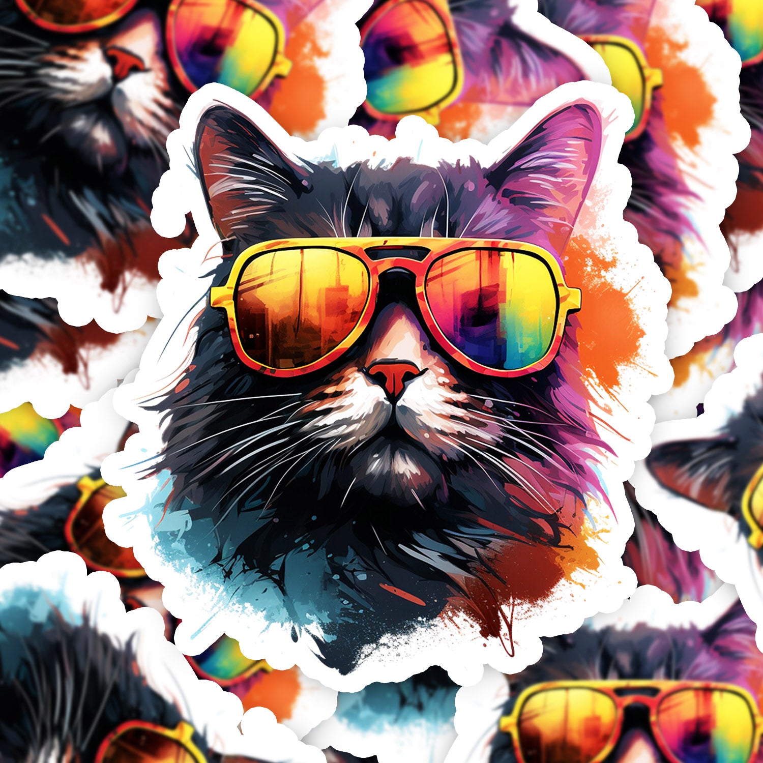 Set 5 bucati, Sticker decorativ, Pisica smechera cu ochelari de soare, Rezistent la apa, NO11580, 6 cm, Multicolor