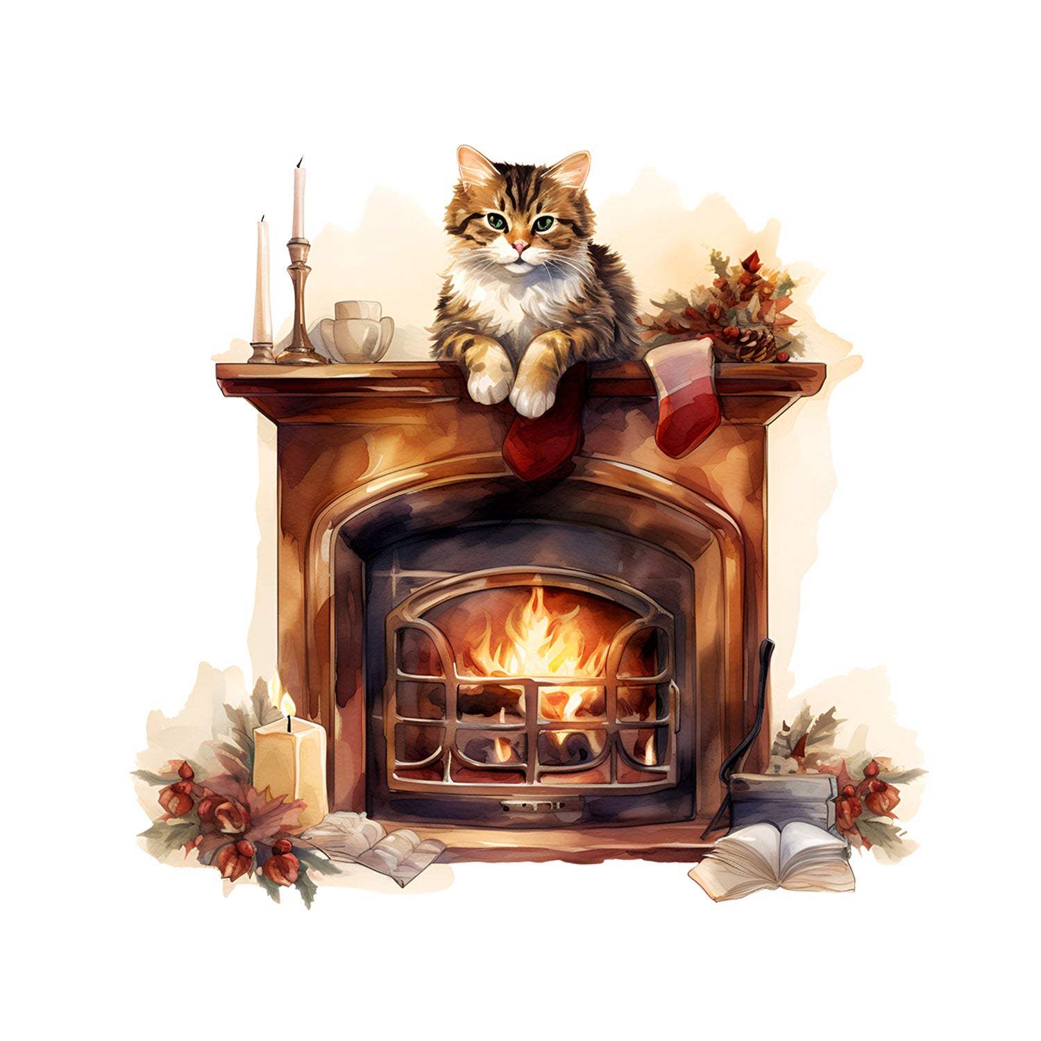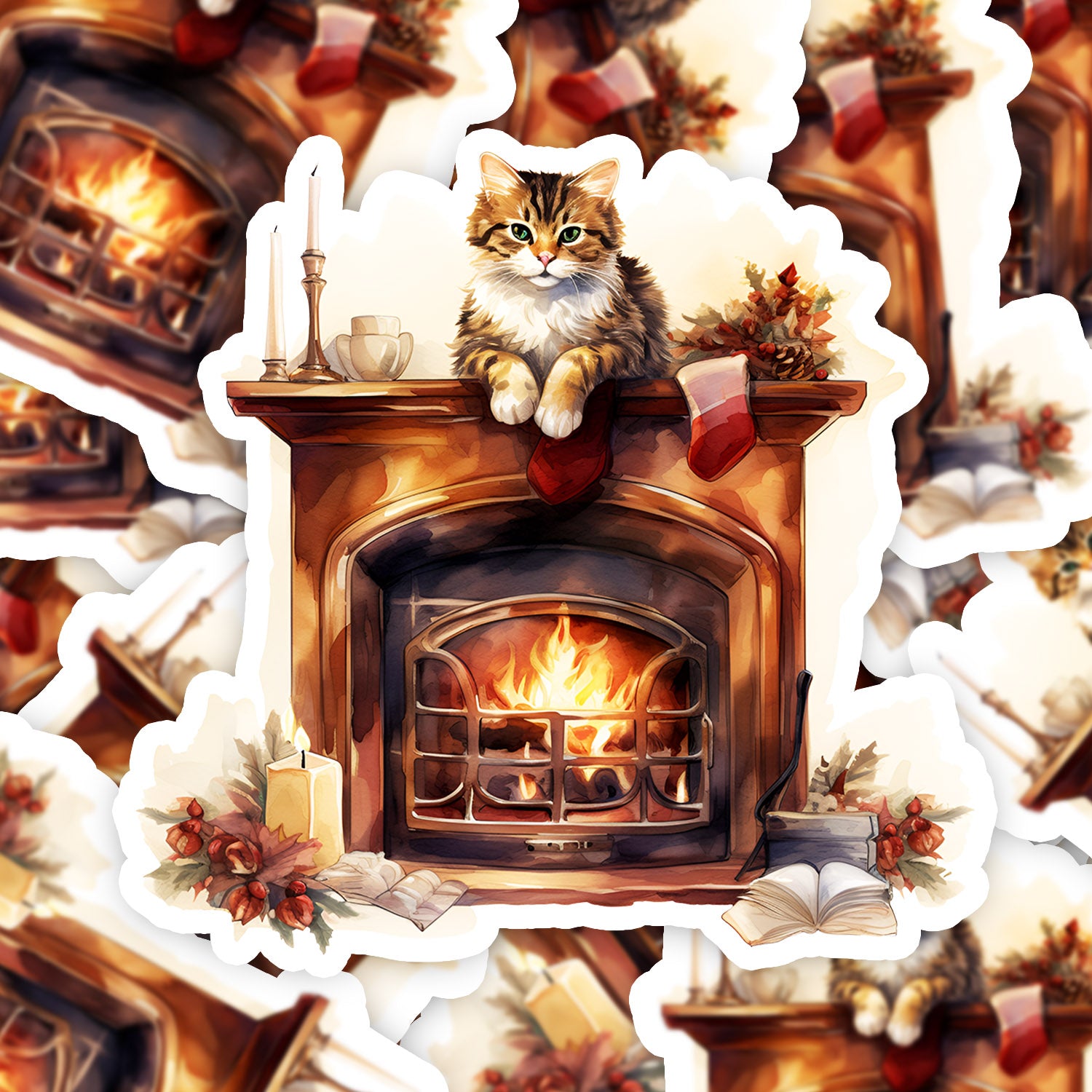 Set 5 bucati, Sticker decorativ, Pisica sus pe semineu, Rezistent la apa, NO15044, 6 cm, Multicolor
