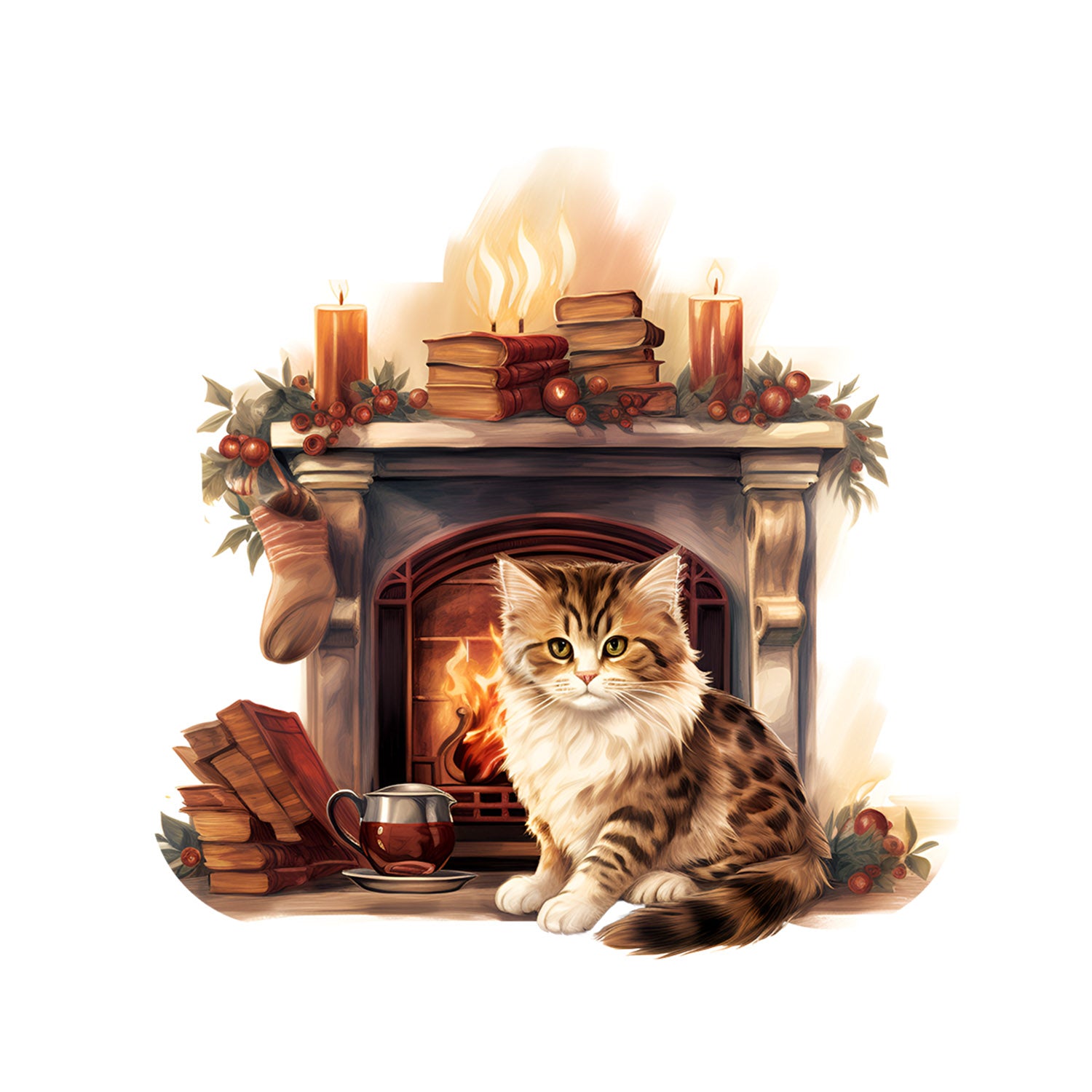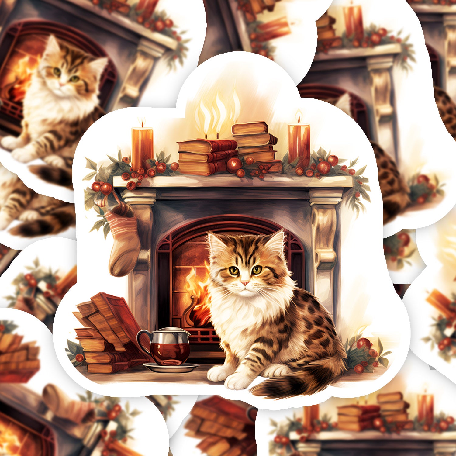 Set 5 bucati, Sticker decorativ, Pisica tigrata bea cafea in fata semineului, Rezistent la apa, NO16137, 6 cm, Multicolor