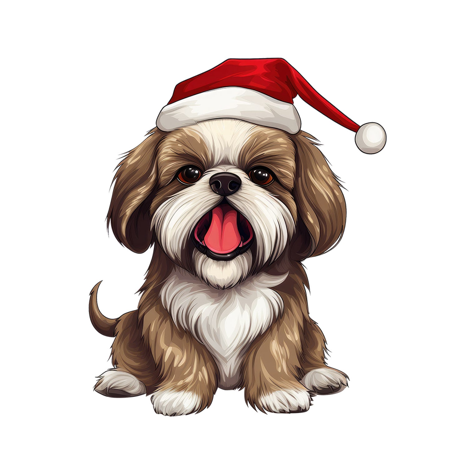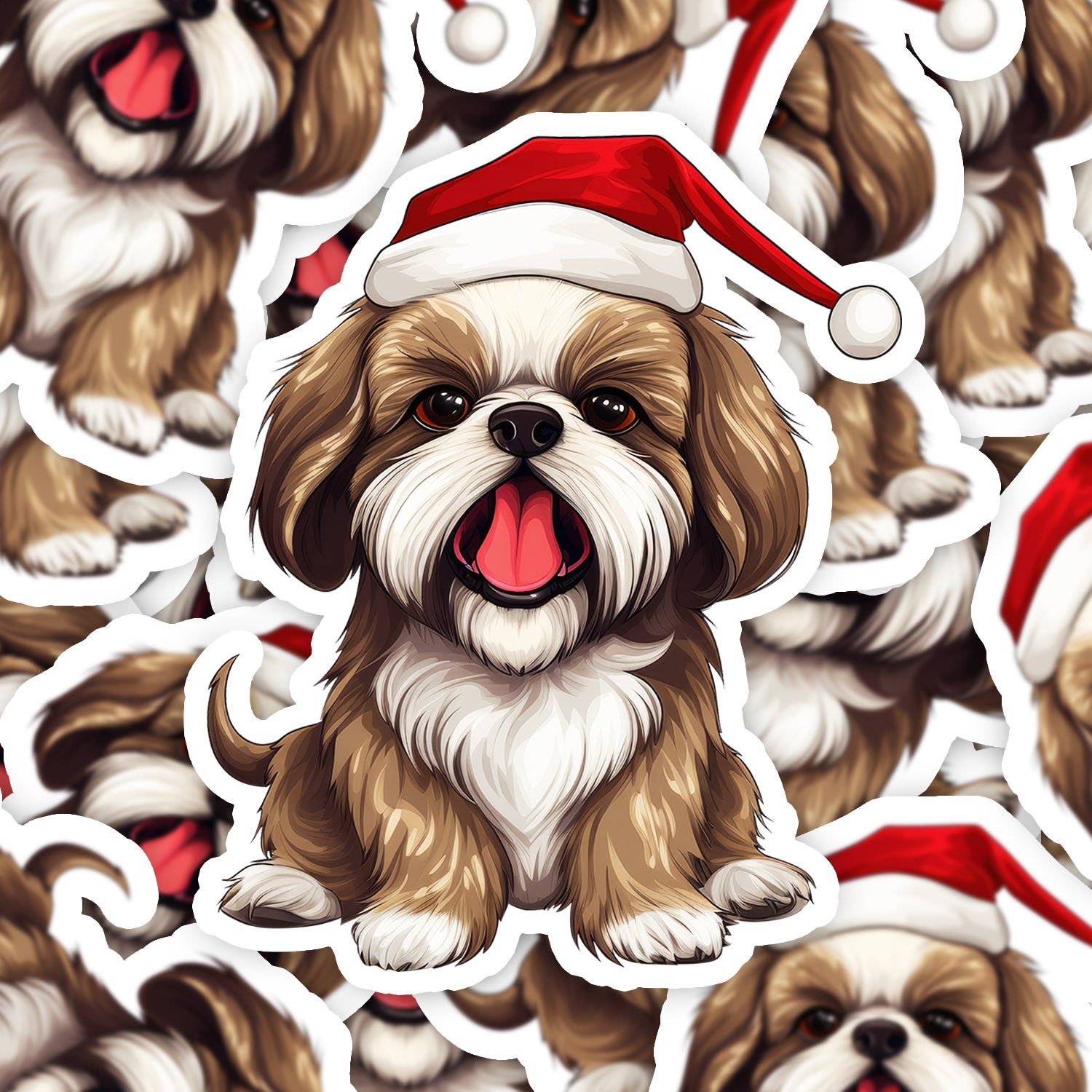 Set 5 bucati, Sticker decorativ, Pui de Shih Tzu cu caciula de craciun, Rezistent la apa, NO11332, 6 cm, Multicolor