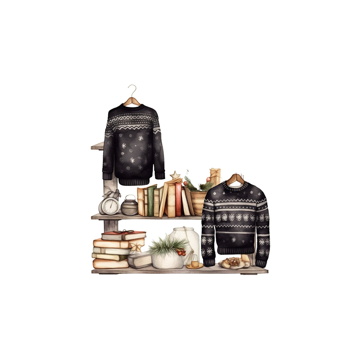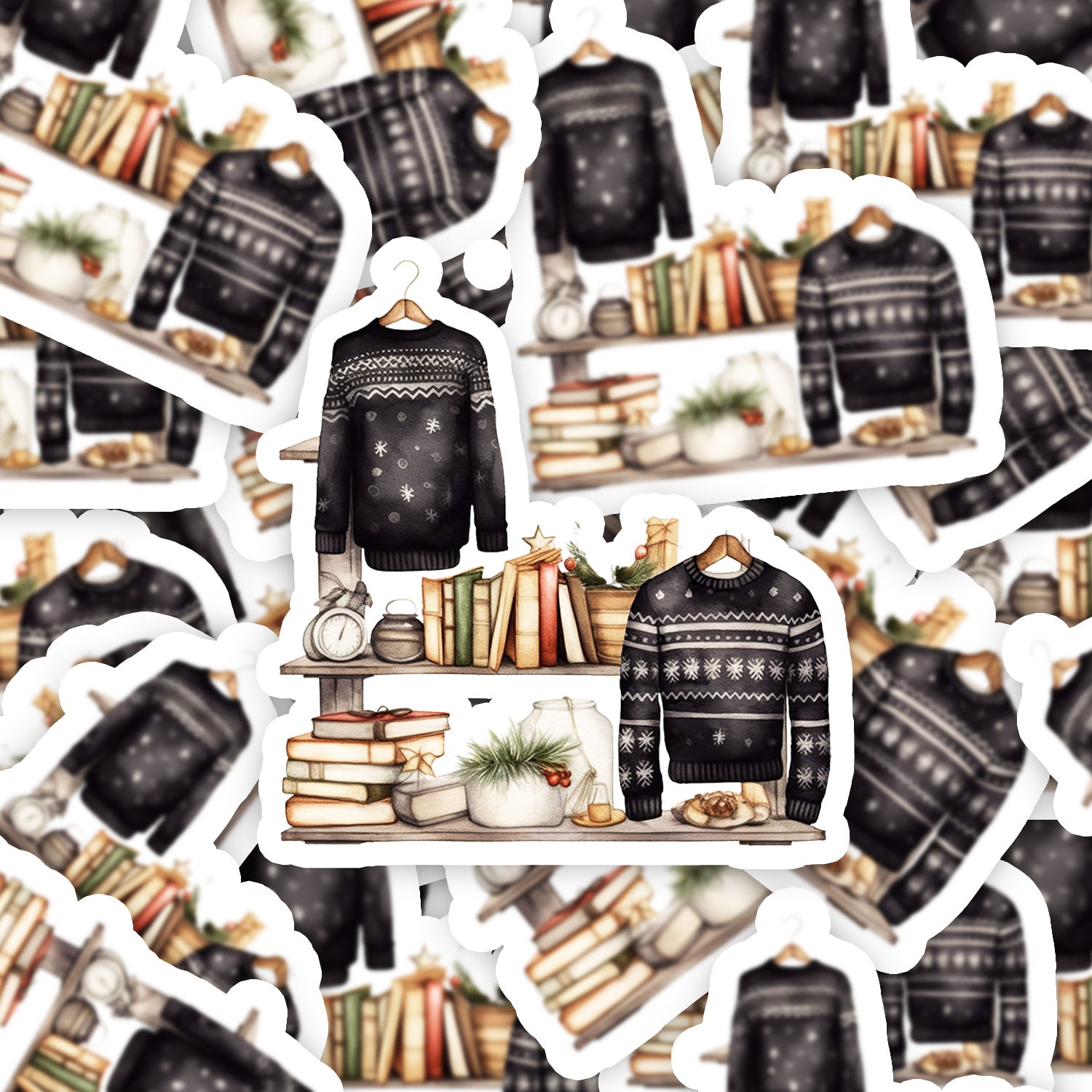 Set 5 bucati, Sticker decorativ, Raft cu carti si lucruri de craciun, Rezistent la apa, NO11608, 6 cm, Multicolor