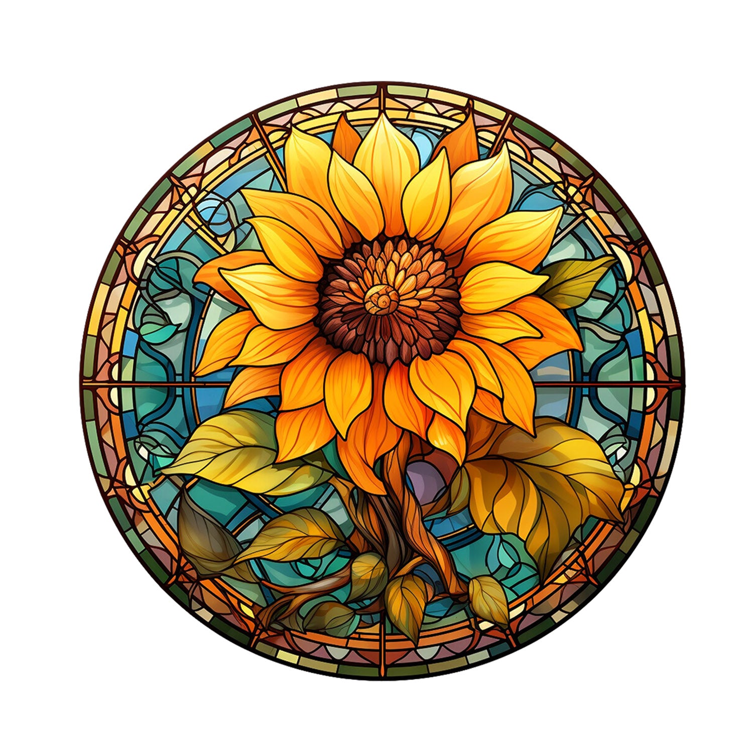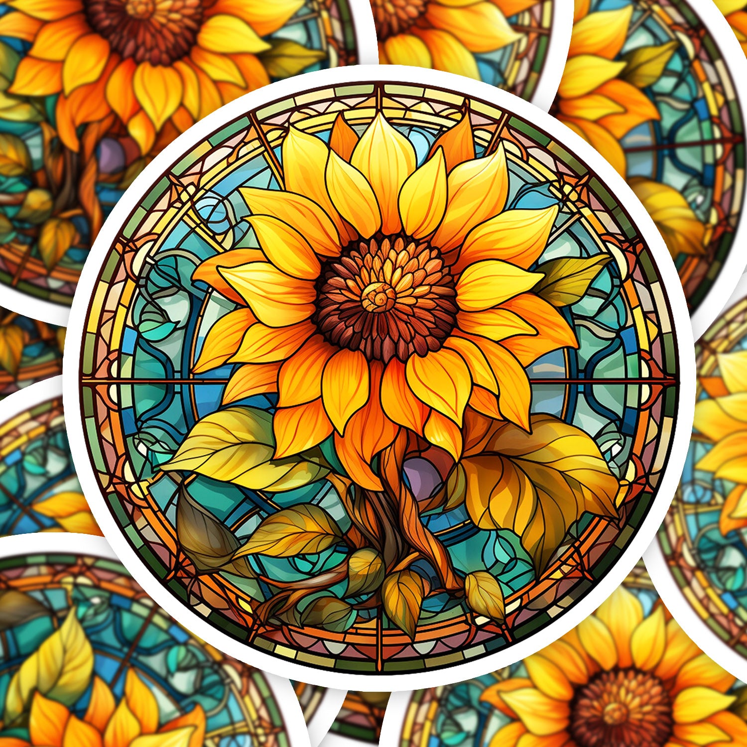 Set 5 bucati, Sticker decorativ, Vitraliu rotund floarea soarelui cu seminte, Rezistent la apa, NO16419, 6 cm, Multicolor