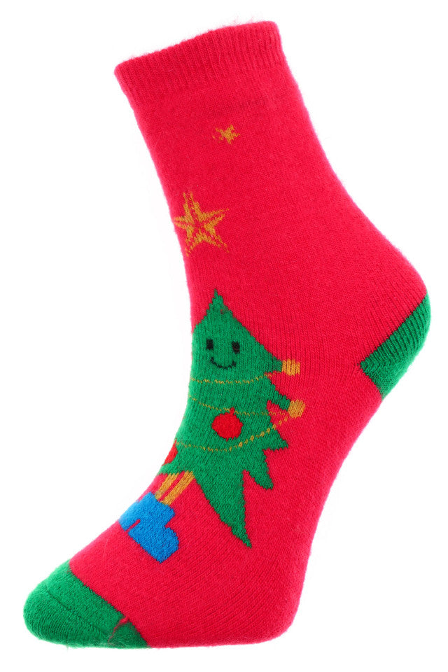 Sosete dama, din lana angora, pentru Craciun, imprimeu Brad de Craciun, marime 38-41, Rosu