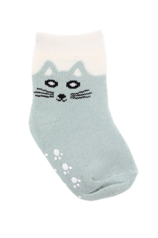 Sosete pentru copii, flausate, antiderapante, 95% Bumbac, imprimeu pisica, 12 - 18 luni, Verde